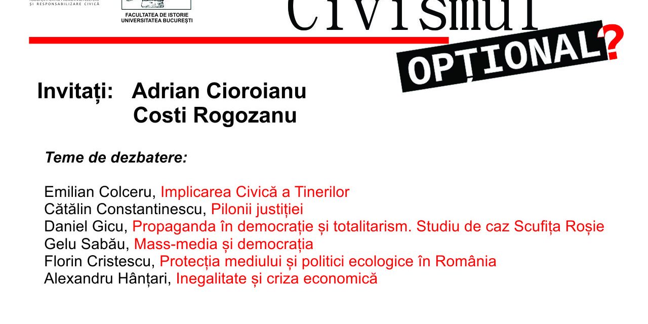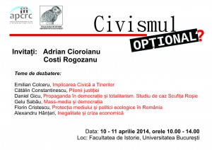 Dacă răspunsul la aceste întrebări este da, poți să participi la cea de-a III-a editie a proiectului “Civismul, opțional?” care se va desfășura în cadrul Facultății de Istorie a Universității București, pe 10 și 11 aprilie 2014, între orele 10.00 și 14.00.